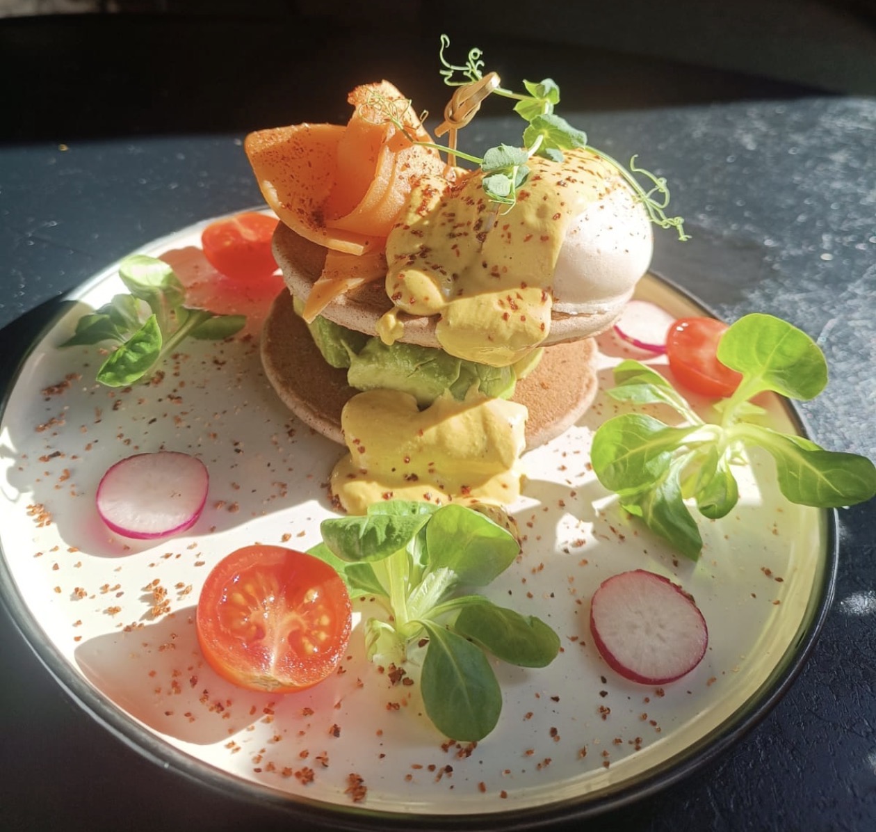 Plant-based salmón ahumado, benedict sedoso sin huevo, aguacate cremoso y nuestra salsa holandesa casera, sobre dos pancakes dorados de sarraceno. Donde lo dulce se encuentra con lo ahumado, pero cero pescado, todo plantas. 13.50