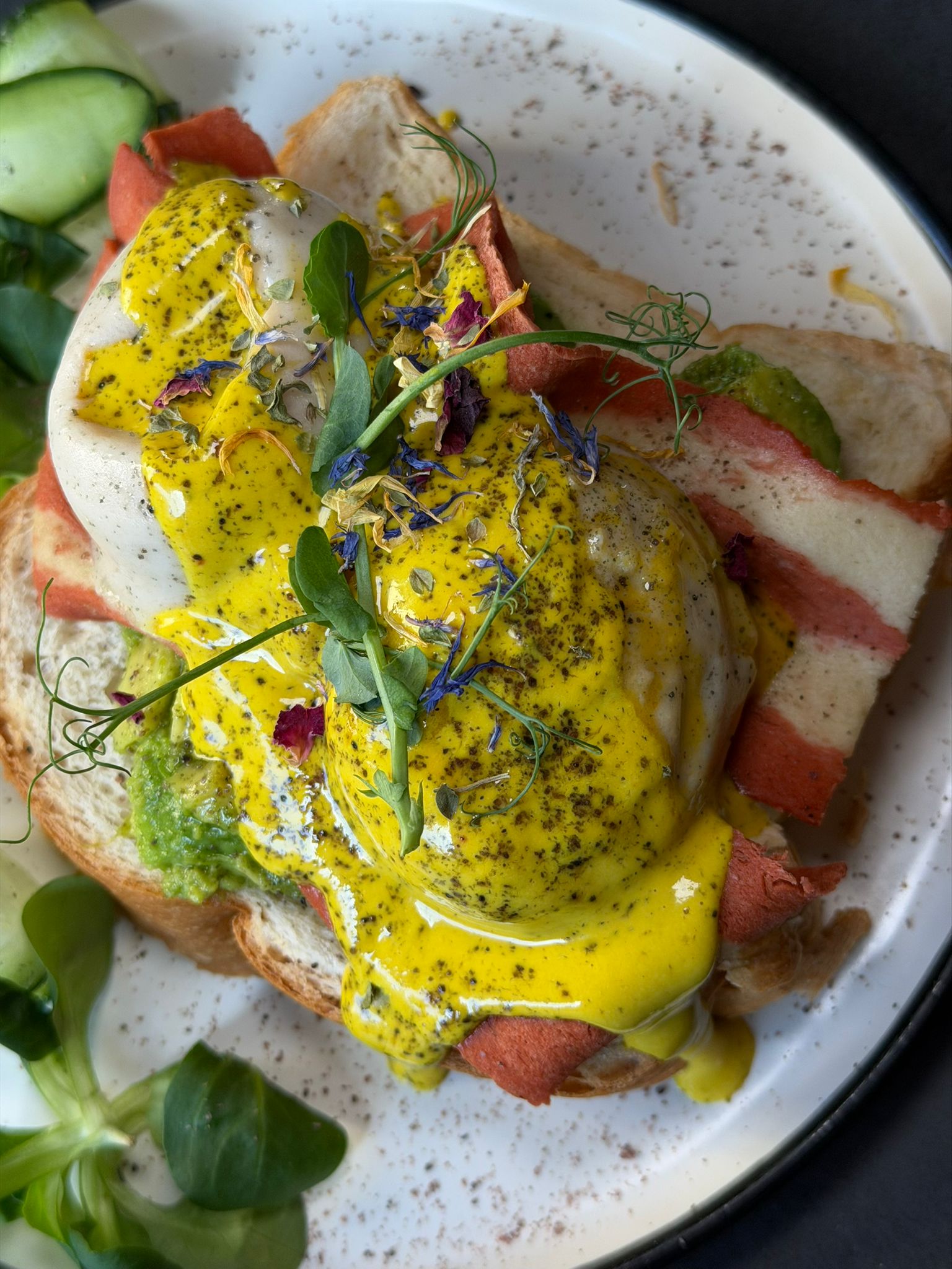 Plant-based smoked salmon, silky egg-style benedict, creamy avocado and our bright house hollandaise sauce, stacked on two golden buckwheat pancakes. The sweet-meets-smoky brunch flex, but zero fish, all plants.